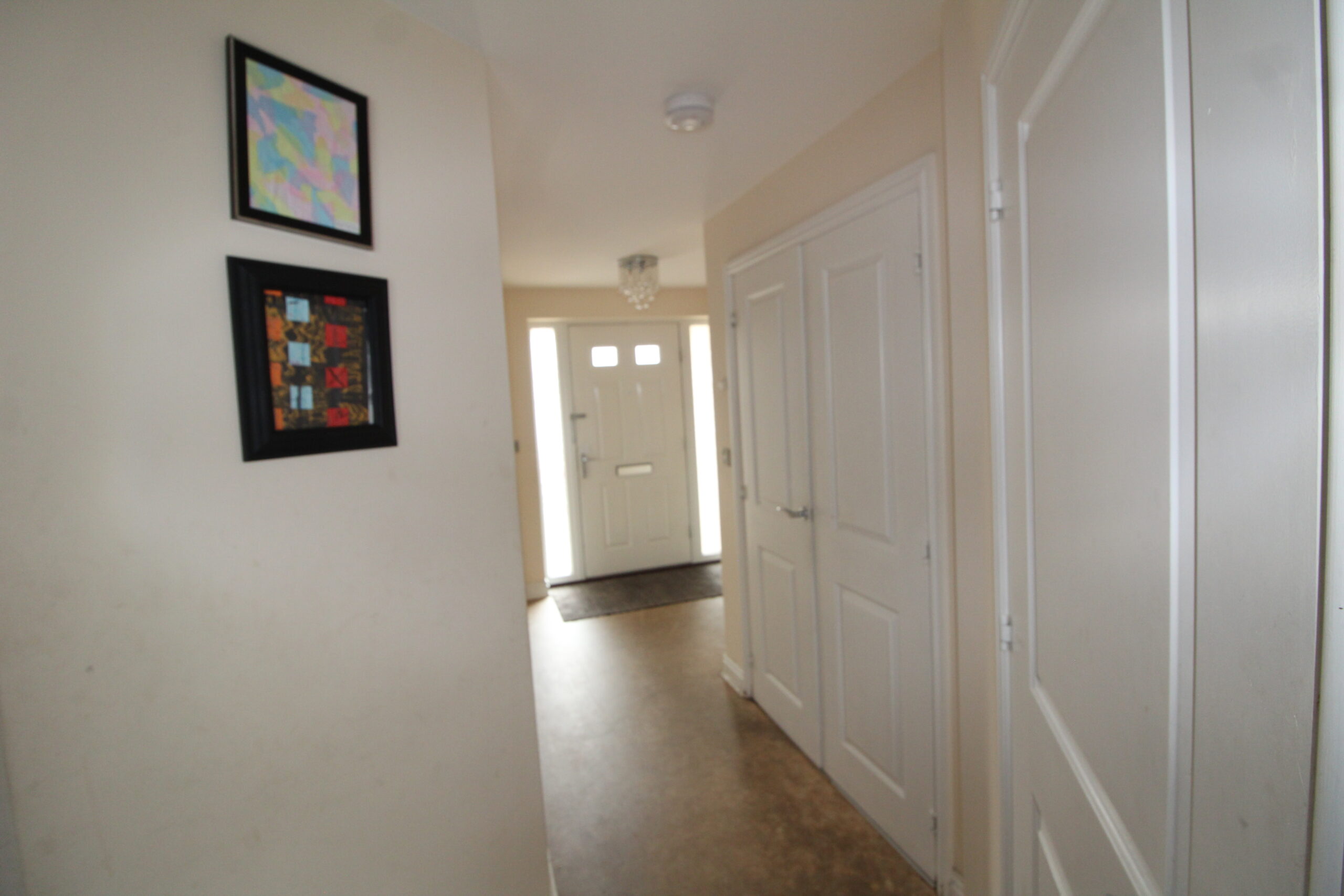 Welcoming entrance hall with vinyl flooring, radiator, ceiling light fitting, and power sockets. Provides access to a utility cupboard, cloakroom, kitchen/diner and stairs to the first floor.
