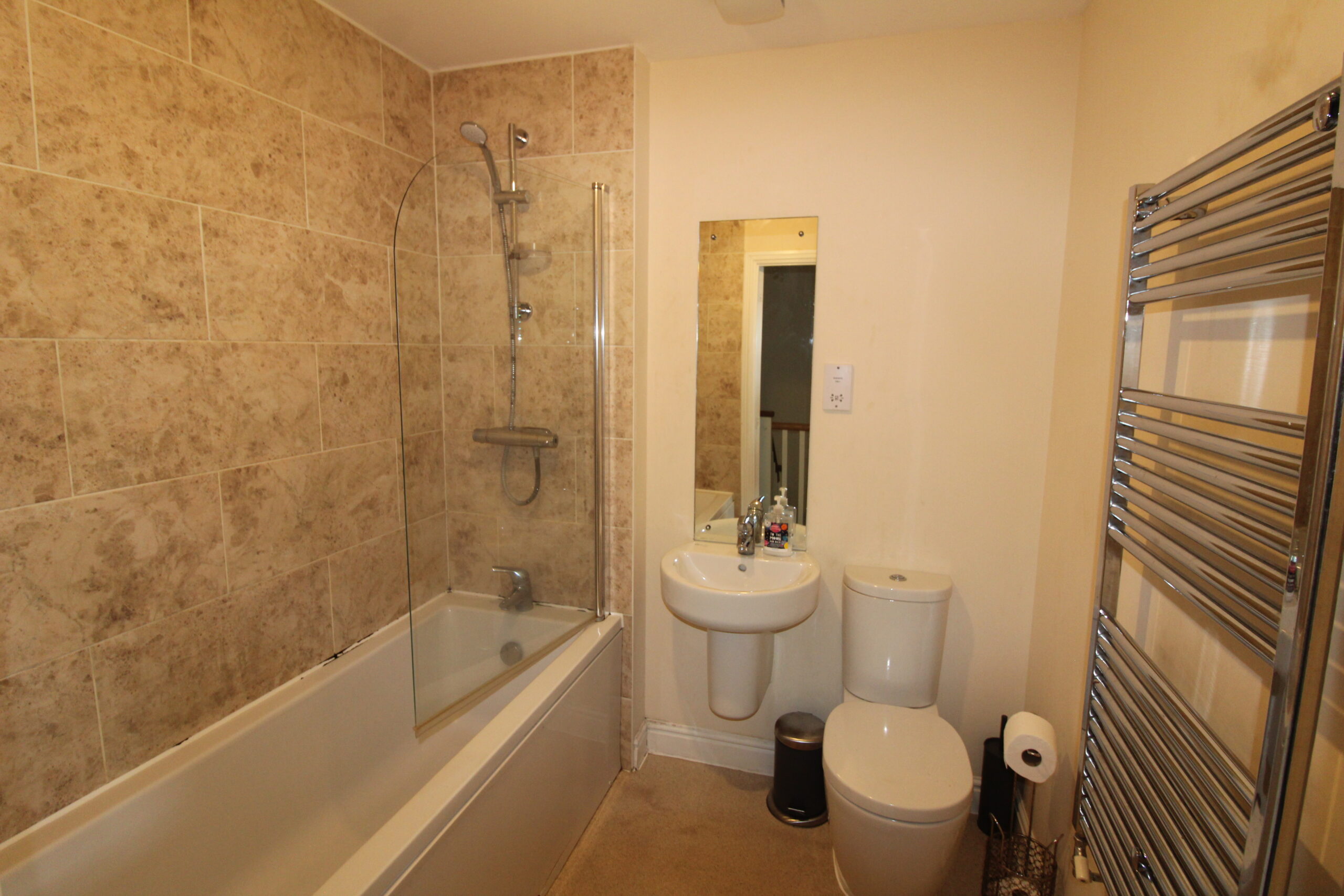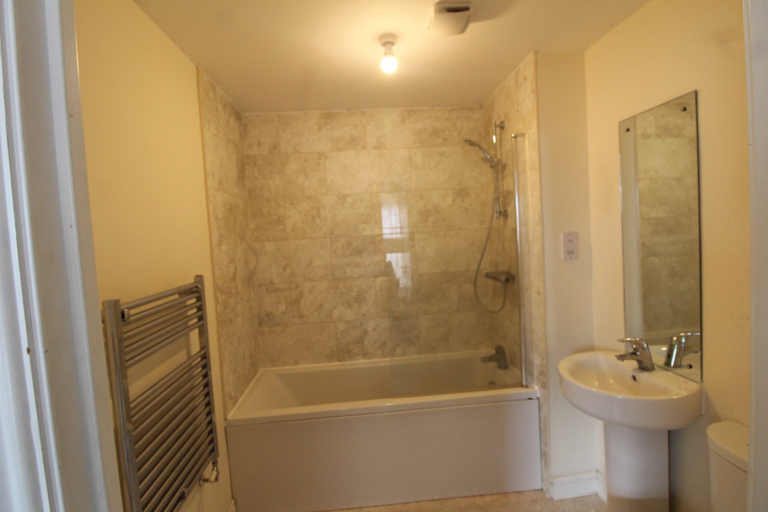 Fitted with a bath, electric shower, WC, wash hand basin, towel rail, extractor fan, light fitting, and vinyl flooring.